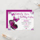 Beijos de borboleta e Aniversário desejam que borboleta roxa seja um Convite de aniversário. Esquema de cor roxa e rosa com borboletas. Garota festa de aniversário lindas borboletas roxas cor-de-rosa e flores arranjo floral fofo