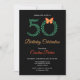 Elegante verde 50º convite de aniversário. Perfeito para uma comemoração na moda feminina de cinquenta por dia. Possui 5 e 0 dígitos feitos de folhas verdes e borboletas laranja ouro no fundo preto. A parte posterior do convite contém borboletas e iniciais. Você pode personalizar facilmente seu convite usando ferramentas online do Zazzle. Se precisar de ajuda na personalização deste cartão, não hesite em contactar-me através do Zazzle.