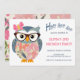 O convite de aniversário de uma garota branca apresenta uma coruja linda vestindo óculos com uma borboleta tocada em sua cabeça e um padrão floral no verso. Perfeito para temas como a natureza, a floresta e a floresta. Trabalho de arte original do KL Stock.