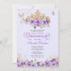 Convite de quinceanera em tons lilás e lavandas de púrpura com borboletas de ouro e uma bela tiara e uma garota de vestido de bola. Visite o compro para obter mais variações no tom de pele e combinações de cores