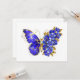 Borboleta de flores cinza, azul, safira, espumante com asa decorada com flores preciosos azuis com folhas de ouro sobre fundo branco.