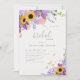 Um elegante quadro floral feito de hortênsias roxas, girassóis, lavanda, trigo, hálito de bebê, mariposa e ranúnculo, pintado à mão em aquarela digital, decora esse elegante chá de panela rústico que apresenta um borboleta dourada (este é um efeito digital, não uma folha real). Romântico e charmoso, é uma escolha encantadora para um chá de panela de celeiro, um chá de panela ao ar livre, um chá de panela de jardim ou quintal ou qualquer cenário rústico.