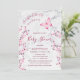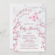 Uma pequena borboleta está a caminho | Borboleta rosa quente e cereja florescem num fundo de mármore branco/cinza leve. Um convite para chá de fraldas de garota bonita com textos personalizados em uma fonte elegante.