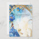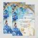 Um belo creme pálido, marfim e fundo de aquarela azul infundidos com espirais beges e brilhantes lamparinas azuis tem pequenas borboletas de ouro e borboletas negras voando entre as espirais. Uma bela mulher está do lado do espectador e está vestindo um vestido de cavalaria azul regal e requintado com rosas e ruffles. Modelos pretas para sua redação personalizada aparecem à direita das espirais e à esquerda da senhora. Esta elegante, luxuosa e moderna design é ideal para a sua filha celebrar o seu aniversário de 15 quinceañera; uma celebração especial de um marco ou se você está hospedando uma chá de panela para ser noiva. Adequado aos eventos de verão, primavera, inverno e outono, este convite é certamente deslumbrante.