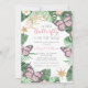Uma borboleta cor-de-rosa está a caminho - Convite para Chás de fraldas. Possui estrelas douradas falsas, borboletas cor-de-rosa flores em folhagem verde-esmagadora. Perfeito para o tema elegante, fofo, "é uma menina", tropical, verde, chá de fraldas floral e borboleta.