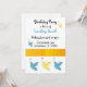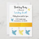 Um fundo branco acentuado por uma borda de borboletas azuis e amarelas bonito com uma banda de amarelo ouro. Personalize com todas as informações de aniversário conforme desejado.
