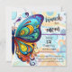 A borboleta grande, brilhante e arco-íris é deslocada para a esquerda deste Dia de as mães de Brunch personalizável. O pano de fundo deste convite de brunch personalizável é um padrão retrô de blues, aqua, verde, roxo e ouro. O reverso deste convite apresenta o padrão retrorreflector em negrito. Personalize a frente desta borboleta inspirada no convite de brunch e adicione todos os detalhes do seu partido.