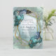 A natureza primavera à vida na nova coleção Borboleta do Paraíso. Espalhaço tropical em azul, turquesa e folhas azul-esverdeadas num padrão preto texturizado com borboletas coloridas. Designs de cartão de personalização combinados com uma estrutura de ouro geométrica para personalizar