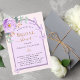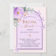 Um fundo cor de pêssego com um arco roxo e colorido violeta. Decorados com um verde-floral, rosa, de cor aquosa, verde-verde-eucalipto e borboletas. Personalize e adicione o nome da noiva a ser e os detalhes da festa.