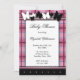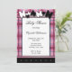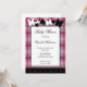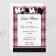 Chamadas Baby Shower com design de xadrez cor-de-rosa descrevendo o convite com um tema ilustrado de borboleta branca e preta.