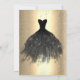 Vestido preto elegante, borboletas, rosas e confete em um fundo de ouro falso.