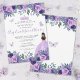 Quinceañera, Púrpura Floral de Aquarela, Convite com Borboletas. Esta design encantadora traz à vida um tema brilhante do jardim floral, perfeito para a celebração da Quinceañera. A frente apresenta delicadas rosas de aquarelas e flores em uma mistura de tons roxos, lilás e violetas profundos, acentuados por folhas verdes macios. Borboletas aquáticas encantadoras flutucam por todo o lado, adicionando um toque mágico. Uma mistura de fontes serif clássicas e tipografia de scripts elegantes melhora a sofisticação e o encanto lúdico do design. No verso, um fundo branco limpo apresenta os mesmos lindos elementos florais junto com uma borboleta aquosa, substituindo a tiara por um detalhe fresco e encantador. O design é totalmente personalizável — ajuste as cores da fonte de acordo com o seu tema ou clareie a aparência selecionando o ícone 'olho' ao lado da camada chamada 'branco transparente' para tornar as cores pop ainda mais intensas. Disponível como um convite impresso ou um arquivo digital para download que você pode enviar por e-mail ou ter impresso localmente, este convite é perfeito para criar uma celebração imaginária e memorável da Quinceañera.