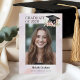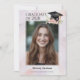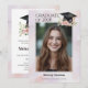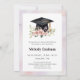 Um convite de festa de formatura limpo e moderno projetado com uma tipografia estilosa de “Graduado de 20XX” para um visual confiante e contemporâneo. A frente apresenta uma única foto do graduado, enquanto os dois lados são acentuados com um elegante fundo abstrato em aquarela. Tons suaves de roxo pálido e rosa avermelhado adicionam um toque gentil e feminino, criando um convite sofisticado e elegante perfeito para celebrar esse marco especial. Uma bela ilustração em aquarela de um chapéu de estudante com borla dourada com lindas flores cor-de-rosa e folhas verdes.