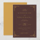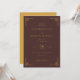 Este convite de casamento elegante apresenta um fundo marrom profundo com bordas geométricas douradas, criando uma estética sofisticada e formal. O design inclui uma mistura de fontes serifadas, sem serifa e manuscritas em dourado, melhorando a legibilidade e o apelo visual, mantendo um clima de celebração. Campos de texto personalizáveis permitem a personalização, tornando-o perfeito para casais que desejam adicionar seu toque único no dia especial. O clima geral é de elegância e requinte, ideal para uma cerimônia de casamento memorável.