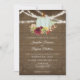 Convite de Casamento Rústico em Madeira com Brilho e Abóbora Azul Bordô Floral. Madeira de celeiro escura e rústica, com luzes cintilantes ao fundo destaca as flores bordô e rosa com uma abóbora azul para um toque moderno. A arte foi pintada à mão em aquarela por Audrey Jeanne Roberts. Conjunto completo disponível para coordenar. Direitos autorais.