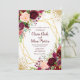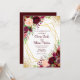Um convite clássico com seus detalhes dentro uma forma geométrica de ouro moderna com polos de rosa lentos em burgundy, rosa e azul com aspergaminhos dourados. A parte traseira da placa exibe um buquê pequeno sobre um fundo burgundy rico. Você pode personalizá-lo completamente clicando no menu personalizar.