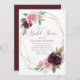 Convide convidados para o chá de panela com nossos convites de chá de panela Borgonha e Blush Floral! Os convites de chá de panela elegantes apresentam uma bela estrutura geométrica de folha de ouro falso, enfeitada com buquês de flores cor-de-água cor rosa e arroxeadas, com folhas verdes escorridas. As palavras 'Chá de panela' são exibidas em uma fonte elegante e burgundy com os detalhes do seu chá apresentados abaixo. O verso do chá de panela floral convida a apresentar um fundo burgundy sólido com espaço para texto adicional.
