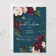 Este design de convite para o almoço de chá de casamento apresenta um tema elegante que é simples, mas espantoso. Um fundo azul escuro é a canvas perfeita para buquês de canto de flores realistas em branco-creme, rosa-pincel, burgundy e azul francês com folhagem verde-senada. Vibrante e rico em cores, este convite faz uma bela declaração. Criado pela imprensa simplesmente de farmácia.