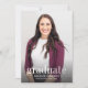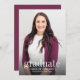 Este simples convite casual para festas de formatura inclui o formando com o nome, a escola e o ano de aulas de graduação. A parte traseira do convite contém todas as informações da parte e a localização em um fundo burgundy com cobertura branca. Substitua o exemplo de foto por sua própria foto de formando e personalize o texto com suas informações.