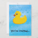 Squeak Squeak vai para o pato de borracha. Legal design personalizado com um caráter amarelo brilhante e um fundo azul borbulhando água. Perfeito para o tempo de banho, piscina ou só para se divertir.