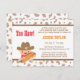 Sim! Este convite tem um bebê bonito vestindo um chapéu de vaqueiro com ícone de estrela e abraçando um brinquedo de travesseiro de bóster laranja igualmente adorável que era um cavalo. Antecedentes do padrão impressão de pele de vaca branca e castanha. Correspondência de excelente para os temas dos chás de fraldas ocidentais e do Texas! Personalize com detalhes da parte entre o espaço disponível.