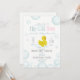 Um convite de chá de fraldas com ilustração de um pato de borracha rodeado por bolhas com texto, "Waddle it be? Ele ou ela"