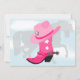 Este convite bonito é perfeito para a festa de aniversário do tema da vaqueira! O convite caracteriza uma bota cor-de-rosa da vaqueira com estrelas brancas e os dentes retos de prata. Sobre a vaqueira a bota descansa um chapéu cor-de-rosa da vaqueira com o emblema de prata da estrela dos xerifes. A bota e o chapéu da vaqueira estão contra um fundo de uma silhueta cinzenta do cavalo entre um céu azul com nuvens brancas. O verso do convite tem o céu azul e nubla-se o fundo e uma cerca marrom do estilo do rancho ao longo da parte inferior. Há um texto na pia batismal do estilo da corda do divertimento, que é inteiramente customizável serir suas necessidades da festa de aniversário da vaqueira! Sua criança amará os convites de festas de aniversários cor-de-rosa da bota, do chapéu e do cavalo da vaqueira!