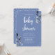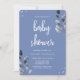 Elegante convite ao chá de fraldas azul com tipografia na moda e adoráveis elementos botânicos.