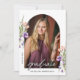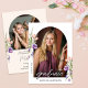This arch photo graduation party invitation is accented with peach and purple flowers and lush greenery. The elegant layout includes space for two photos and is adorned with delicate handwritten script. Personalize the back with your party details to complete the design.