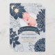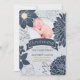 Ilustrações florais azuis marinhos, espalhadas em azul pálido para mostrar a foto do menino no convite para sua cerimônia de Natal.