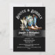 Um par de couros de botas de cowboy castanhas e azuis, com um padrão floral de ornamentado branco, e flores silvestres, tem um vidro aquoso de borbulha e martini junto a ele, colocado sobre uma banda preta horizontal, cintilante, sobre um fundo preto. Modelos de texto branco editáveis podem ser personalizadas para se adequarem à sua celebração especial. Este convite para descarregamento de na moda é ideal para um evento especial de temas ocidentais, "botas e borras" no país ou "botas e borbulhas" também.