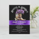 Uma bota de cowboy marrom-ferramentas tem flores florais roxas nela e tem uma flauta de champanhe rico no seu conjunto esquerdo sobre uma banda horizontal roxa de shimmer que parece brilhar e brilhar sobre um fundo preto. Modelos de texto branco editáveis podem ser personalizadas para se adequarem à sua celebração especial. Este convite para descarregamento de na moda é ideal para um evento especial de temas ocidentais, "botas e borras" no país ou "botas e borbulhas" também.