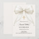 Celebrate your daughter's milestone with this elegant Confirmation invitation. This design features a stunning, oversized ivory silk bow adorned with delicate pearl strands and a central ornate gold cross. It is the perfect choice for a traditional Catholic ceremony or a sophisticated religious celebration for a young girl.