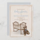 Esta design apresenta um convite clássico de vintage, de um bebê azul, com um típico convite, com um ursinho clássico, um ursinho de pelúcia de urso de tendência, uma tipografia elegante com script de caligrafia, um código QR para o ícone do registro de presentes para sites de loja online, um convite clássico clássico de tendências, um beliche de berço de berço vintage, um bege azul castanho castanho. um estilo simples e antiquado, para um convite a chá de um menino, para um trabalho de arte desenhado à mão por um rapaz ou uma menina por Laura Lacina.
