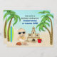 Este belo convite de aniversário de praia para rapazes mostra um bebê de praia fofo a beber o seu auxílio de limão. Ele está de pé com seus amigos do mar um caranguejo e estrela do mar, um impressionante castelo de areia e seu prato de surfe rodeados por palmeiras tropicais. Alguns gráficos em artwork©delightful-doodles.com e CherylSeslarDesigns.com em DigiWebStudio.com.