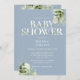 Um convite elegante para o chá de fraldas com tipografia elegante e folhagem botânica bonito em fundo azul empoeirado. Projetado por Thisnotme©