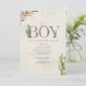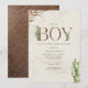 Tema do chá de fraldas Boho com a inscrição "Boy" em couro inspirou textura falsa decorada com boho cactus e outros designs botânicos. Designs botânicos nos cantos. O fundo é a aquarela inspirada. O lado inverso é design de couros falsos inspirados.