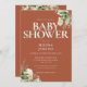 Um elegante convite de chá de fraldas com tipografia elegante e folhagem botânica bonito em fundo de terracota. Projetado por Thisnotme©