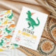 Get ready to stomp and roar! This fun and modern boys’ 4th birthday invitation features a cheerful T-Rex in a party hat, perfect for any little dinosaur lover. The back showcases a colorful jungle-themed dinosaur pattern with leafy plants and prehistoric vibes to match the celebration.