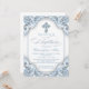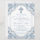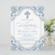 Convite de batismo azul com bela cruz de diamante azul e roteiro elegante em um bonito fundo azul e rolo branco. Este elegante convite para batismo azul é facilmente personalizado para o seu evento simplesmente adicionando os seus detalhes no estilo de letra e cor, e o texto da sua escolha.