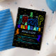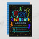 Salta e comemora com este convite de aniversário para meninos neon coloridos! Com texto em negrito, silhuetas saltitantes e sotaques de estrelas divertidas — perfeito para uma festa de trampolim ou salto. Definido como um convite de 8 anos, mas totalmente personalizável.