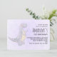 Um convite de aniversário com uma ilustração fofinha com um dinossauro roxo cinzento.