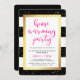Estes convites glam, elegantes caracterizam listras preto e branco, beira e confetes do ouro do falso, e tipografia cor-de-rosa moderna.