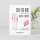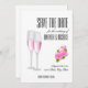 Design feminino e lindo combina um fundo branco elegante com uma tipografia moderna incrível e flores cor-de-rosa, bem como taças de champanhe. O cartão Save The Date para o seu casamento é importante e você merece o melhor. Este design elegante e luxuoso será perfeito.