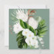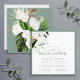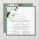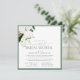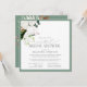 Chá de panela virtual quadrado moderno, elegante, com um buquê de orquídeas brancas e proteas, e verde botânico tropical, bordado em verde-pálido de eucalipto. Personalize os detalhes do seu chá de panela em branco suave, acentuado com uma bela caligrafia manual. A parte traseira da placa apresenta um buquê tropical embebido sobre uma textura verde pálida correspondente. Copyright Elegant Invites, todos os direitos reservados.