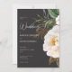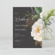 Nosso convite para casamento preto de carvão com uma peônia branca em greve, centro amarelo mole, verde-luxuoso, e chumbos delicados de algodão é uma obra-prima moderna. O texto branco nítido adiciona um toque de elegância, enquanto o fundo escuro cria um pano de fundo dramático para o seu dia especial. Esta design é uma mistura impressionante de elegância moderna e romance eterno. Criado pela imprensa simplesmente de farmácia.