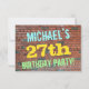 Este design de convite de aniversário divertido apresenta uma mensagem como "A 27ª FESTA DE ANIVERSÁRIO do MICHAEL!", onde o nome pode ser personalizado, na frente. O fundo apresenta uma representação de uma parede de tijolos constituída por alguns tijolos de cor castanha avermelhada. O texto de mensagem personalizável na frente apresenta cores como azul, amarelo e verde, e tem uma aparência inspirada pelo grafite pintado. A parte traseira apresenta uma mensagem personalizável que pode incluir detalhes relevantes sobre a festa de aniversário. Convites de festas de aniversários como esta podem ser uma maneira divertida de convidar a família e os amigos para uma festa de aniversário que está sendo realizada para alguém que está comemorando seu vigésimo sétimo aniversário. [~Z0000287]