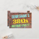 Este design de convite de aniversário divertido apresenta uma mensagem como "A 38ª FESTA DE ANIVERSÁRIO da GEORGIANA!", onde o nome pode ser personalizado, na frente. O fundo apresenta uma representação de uma parede de tijolos constituída por alguns tijolos de cor castanha avermelhada. O texto de mensagem personalizável na frente apresenta cores como azul, amarelo e verde, e tem uma aparência inspirada pelo grafite pintado. A parte traseira apresenta uma mensagem personalizável que pode incluir detalhes relevantes sobre a festa de aniversário. Convites de festas de aniversários como esta podem ser uma maneira divertida de convidar a família e os amigos para uma festa de aniversário que está sendo realizada para alguém que está celebrando seus trinta e oito anos. [~Z0000287]