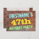 Este design de convite de aniversário divertido apresenta uma mensagem como "A 47ª FESTA DE ANIVERSÁRIO do FIRSTNAME!", onde o nome pode ser personalizado, na frente. O fundo apresenta uma representação de uma parede de tijolos constituída por alguns tijolos de cor castanha avermelhada. O texto de mensagem personalizável na frente apresenta cores como azul, amarelo e verde, e tem uma aparência inspirada pelo grafite pintado. A parte traseira apresenta uma mensagem personalizável que pode incluir detalhes relevantes sobre a festa de aniversário. Convites de festas de aniversários como esta podem ser uma maneira divertida de convidar a família e os amigos para uma festa de aniversário que está sendo realizada para alguém que está comemorando seus quarenta e sete anos. [~Z0000287]