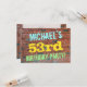 Este design de convite de aniversário divertido apresenta uma mensagem como "A 53ª FESTA DE ANIVERSÁRIO do MICHAEL!", onde o nome pode ser personalizado, na frente. O fundo apresenta uma representação de uma parede de tijolos constituída por alguns tijolos de cor castanha avermelhada. O texto de mensagem personalizável na frente apresenta cores como azul, amarelo e verde, e tem uma aparência inspirada pelo grafite pintado. A parte traseira apresenta uma mensagem personalizável que pode incluir detalhes relevantes sobre a festa de aniversário. Convites de festas de aniversários como esta podem ser uma maneira divertida de convidar a família e os amigos para uma festa de aniversário que está sendo realizada para alguém que está comemorando seus cinquenta e três anos. [~Z0000287]
